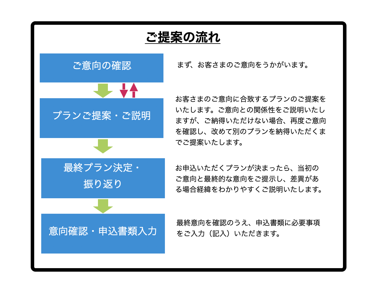 (3)ご納得いただき、保険商品のお申込みをいただく場合、ご相談開始当初の意向とお申込み時の意向について再度ご確認させていただきます。